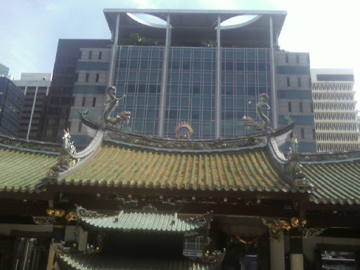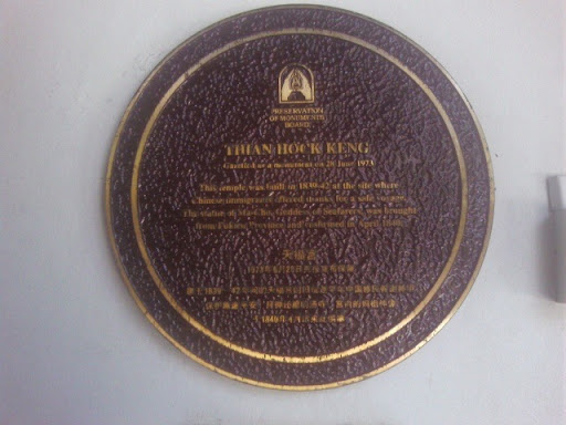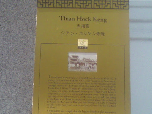 Thian Hock Kheng (THK) was bult in mid 19 centuries, it was considered the oldest temples built by the Chinese. There was another version that mentioned that no nails were found in the initial building of this temple. It had almost 200 years of history, for the past decades it had stood along the aisle of Telok Ayer Street. It has also hence became a source of tourist attraction in Singapore. It witnessed the Chinese's development for the past decades, and had preserve Fujian's culture. As Fujian nears the sea, this temple was primarily a court that worships Ma Zu (妈祖,also known as Tian Hou 天后 or Heavenly Queen) who was famous for her filial piety to her parents and a protector for the people who sails in the sea.
